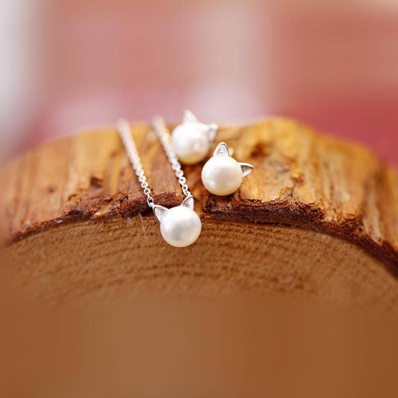 Beautiful Pearl Cat Necklace with Bonus Earrings + Ring
